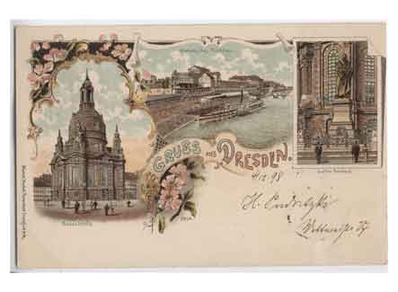 Grußkarte aus Dresden mit Frauenkirche und Dampferanlegestelle. Historische Ansichtskarte um 1905.