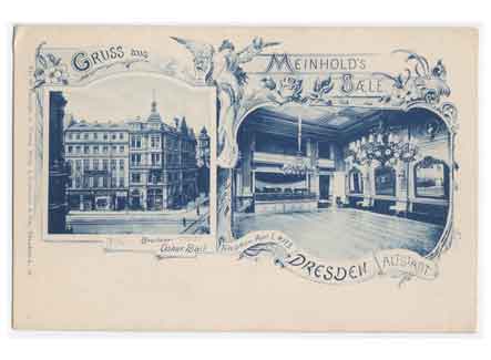 Grußkarte aus dem Meinholds Saal. Historische Ansichtskarte um 1905.