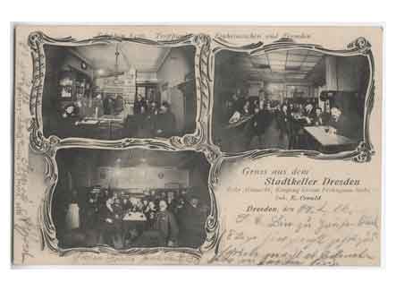 Grußkarte aus dem Stadtkeller Dresden. Historische Ansichtskarte um 1905.