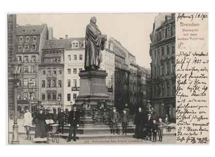 Blick auf das Martin-Luther-Denkmal am Neumarkt. Historische Ansichtskarte um 1905.