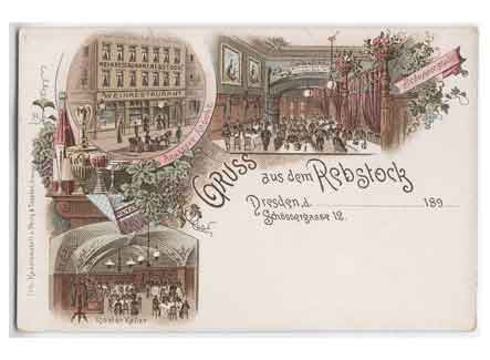 Grußkarte aus dem Weinrestaurant "Rebstock". Historische Ansichtskarte um 1900.