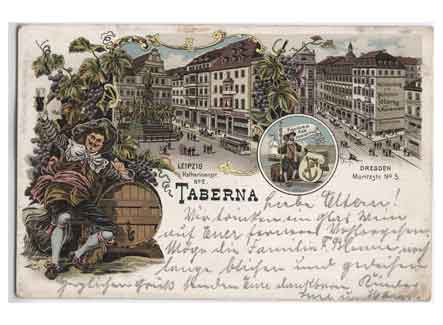 Grußkarte aus den Taberna-Weinstuben. Historische Ansichtskarte um 1900.