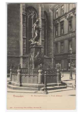 St. Georgsbrunnen von Ernst Julius Hähnel an der Sophienkirche. Historische Ansichtskarte um 1905.