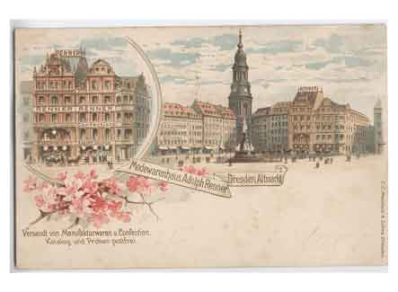 Grußkarte aus Dresden mit dem Altmarkt und dem Modewarenhaus Adolph Renner. Historische Ansichtskarte um 1900.