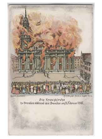 Die Kreuzkirche während des Brandes am 16. Februar 1897. Historische Ansichtskarte um 1900.