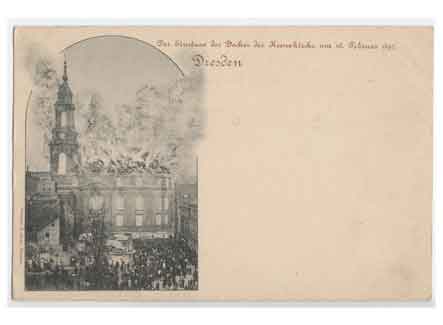 Die Kreuzkirche während des Brandes am 16. Februar 1897. Historische Ansichtskarte um 1900.