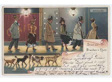 Grußkarte mit einer künstlerischen Darstellung des Altmarkts bei Nacht. Historische Ansichtskarte um 1900.