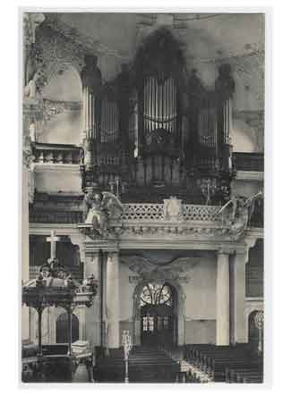 Blick in das Innere der Frauenkirche (?) mit Orgel. Historische Ansichtskarte um 1910.