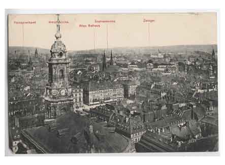 Innere Altstadt Blick auf die historische Altstadt mit der katholischen Hofkirche im Vordergrund. Historische Ansichtskarte um 1910. |