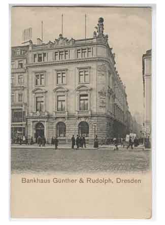 Blick auf das Bankhaus Günther & Rudolph. Historische Ansichtskarte um 1905.