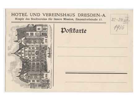 Pirnaische Vorstadt Postkarte mit Abbild des Hotels und Vereinshauses, Hospiz des Stadtvereins für Innere Medizin in der Zinzendorfstraße 15.(?). Historische Ansichtskarte um 1916. |